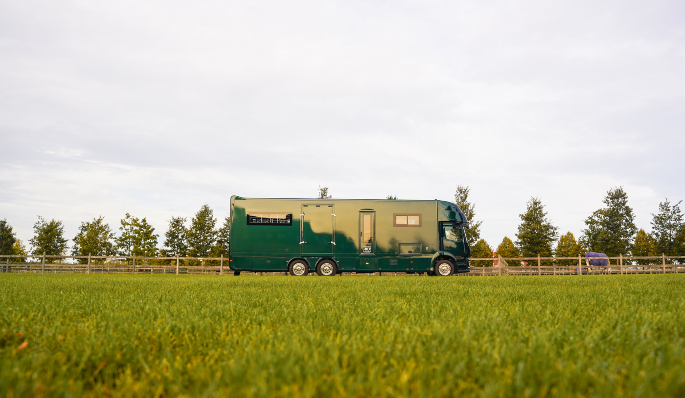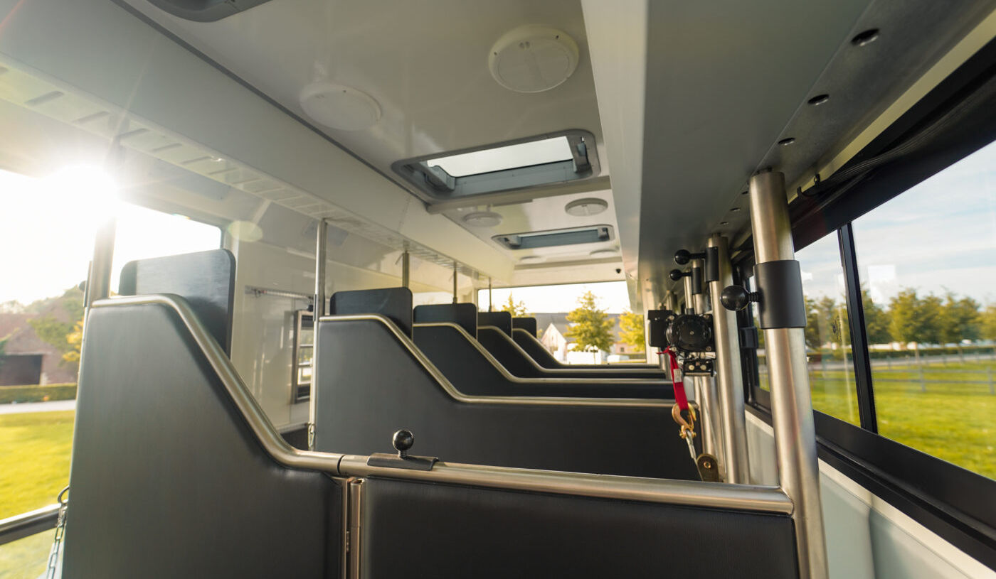 Gummigulv, takvinduer, kjølevifter, overvåkningskamera, justerbare skillevegger, side- og bakrampe, teppestativ, sadelskap, temperaturregistrering, vannslange, vanntank.