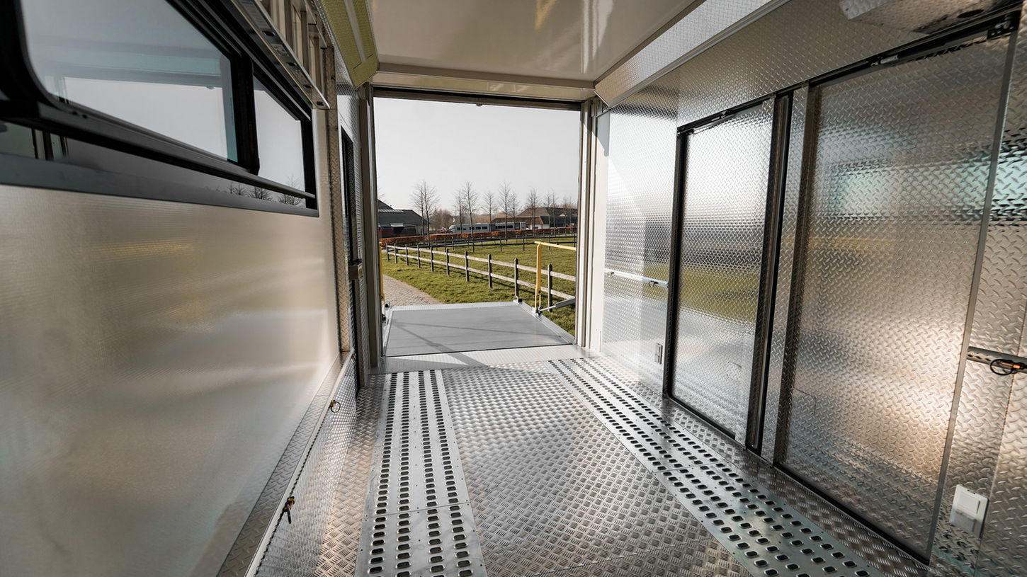D'Hollandia hydraulisk heis, stor dobbel dør på venstre side, 2 manuelt åpne takvinduer, kaldtvannstilkopling, trykklufttilkobling, oppvarming og festeskinner.